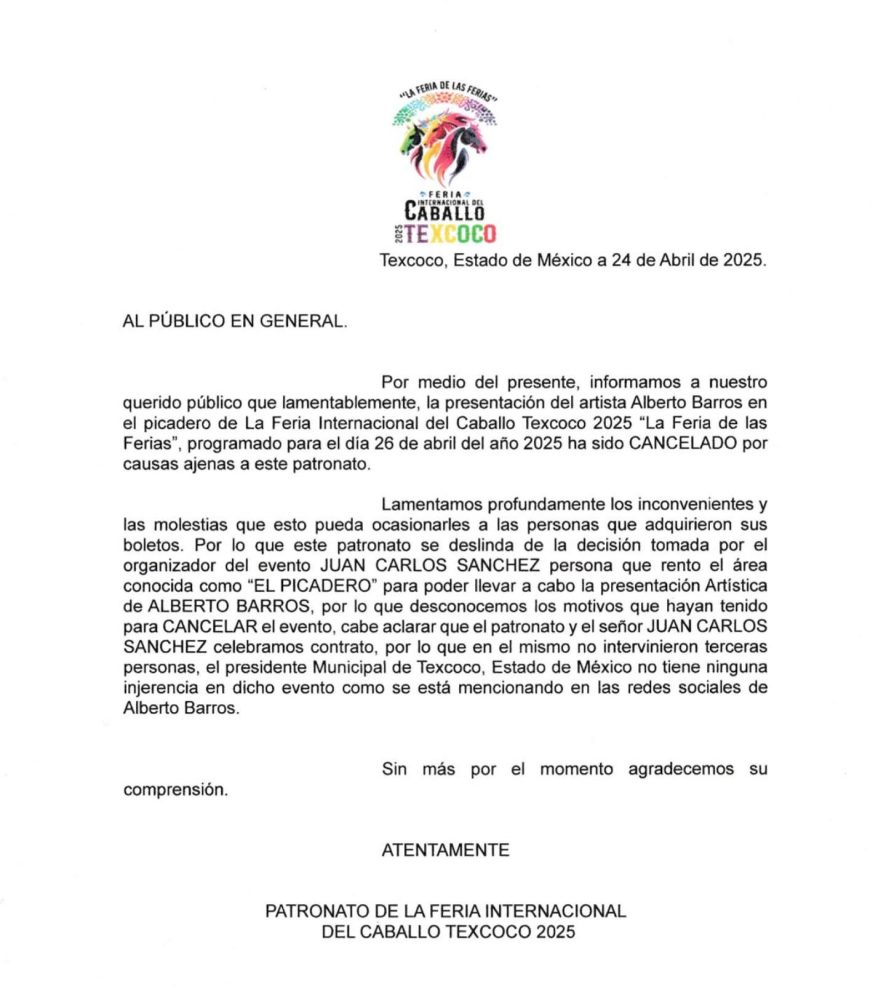 El intérprete de música salsa, Alberto Barros, anunció la cancelación de su presentación programada para el cierre de la Feria Internacional del Caballo en Texcoco, con el argumento de que el promotor y el alcalde Nazario Gutiérrez incumplieron con pagos estipulados y a quienes acusa de fraude por presentar fichas de depósito falsas.