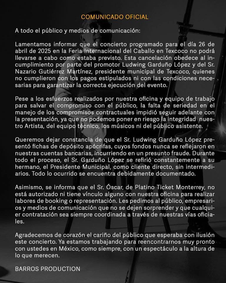 A unos días de que concluyan las festividades, el salsero emitió un comunicado en el que expuso la supuesta falta de seriedad en el manejo de los compromisos contractuales, así como de fichas apócrifas de depósitos. “Esta cancelación obedece al incumplimiento por parte del promotor Ludwing Garduño López y del Sr. Nazario Gutiérrez Martínez, presidente municipal de Texcoco, quienes no cumplieron con los pagos estipulados ni con las condiciones necesarias para garantizar la correcta ejecución del evento”, se escribió en el documento.